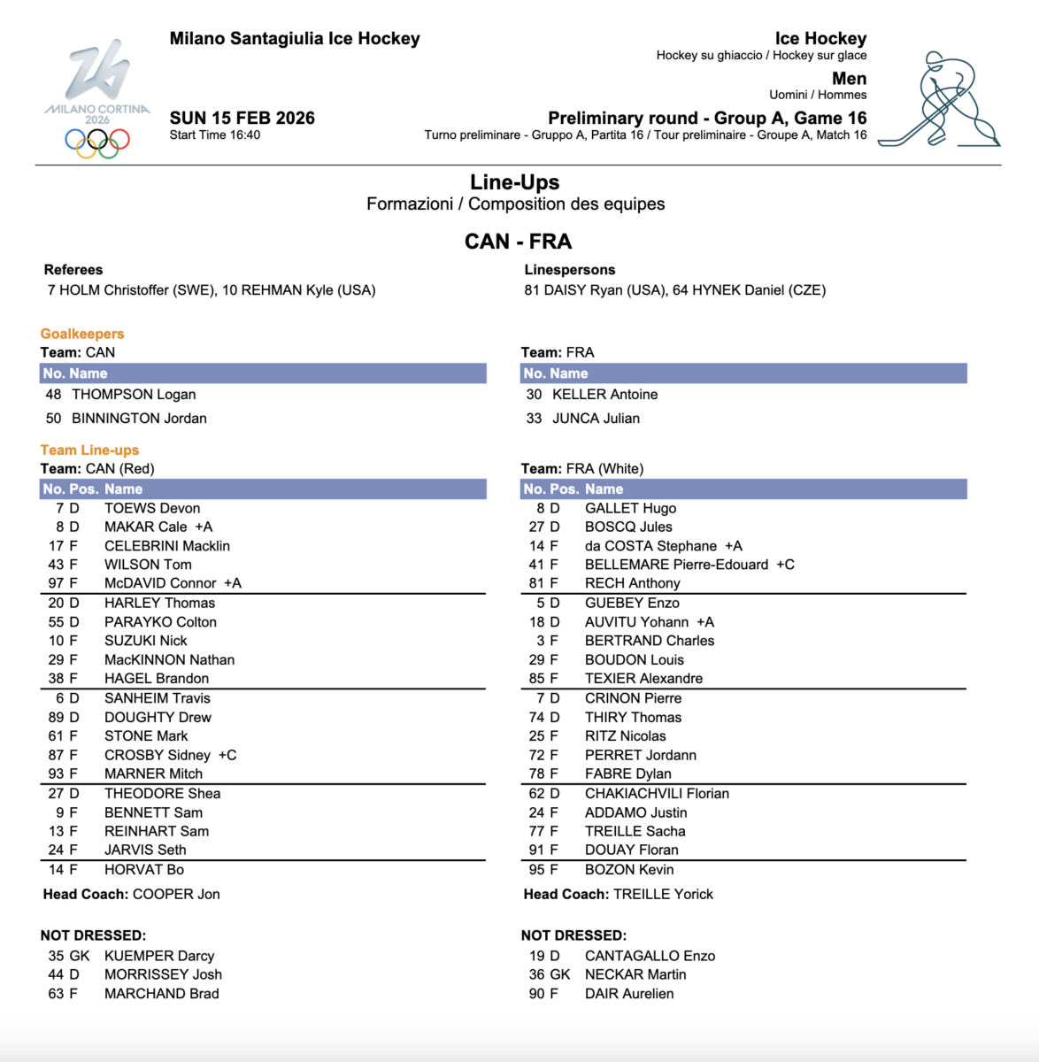 À Santagiulia, le rouleau compresseur canadien a encore frappé. Déjà assuré de terminer en tête du groupe A, le Canada a corrigé la France 10-2 cet après-midi. Une formalité au classement? Pas tout à fait. Si la hiérarchie du groupe était figée avant même le coup d’envoi – Canada premier, France dernière – l’enjeu restait majeur: finir en tête du classement général. Un détail capital en vue du rebrassage des quarts de finale. Pour devancer les États-Unis, également leaders de leur poule, les Canadiens devaient soigner la différence de buts. Mission accomplie: ils bouclent le tour préliminaire avec un impressionnant +17 (20 buts marqués, 3 encaissés). Les Américains, eux, pointent à +7 (11-4) et devront étriller l’Allemagne par dix buts d’écart pour ravir la pole position. Pas moins de quinze joueurs canadiens ont noirci la feuille de match. Macklin Celebrini a signé un doublé et une passe décisive. Connor McDavid, Sidney Crosby et Mark Stone ont chacun empilé trois points (un but, deux assists).