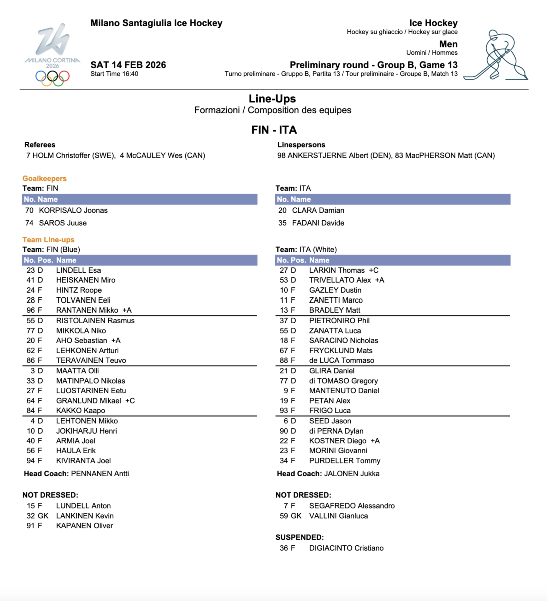 Le deuxième tiers a viré à la démonstration. Joel Kiviranta (24:04), Kakko (27’39) et Granlund (37:36) ont porté la marque à 6-0. L’Italie a bien cru sauver l’honneur en infériorité numérique, mais Juuse Saros a fermé la porte. Le troisième acte n’a été qu’une formalité. Miro Heiskanen (41:01), Artturi Lehkonen (41:34), Aho (43’:3), Joel Armia (53:26) et Kiviranta (57:13) ont complété la feuille des compteurs. Kakko (2 buts, 1 assist), Lehkonen (1+2), Granlund (2+?), Aho (2), Kiviranta (2) : la profondeur offensive finlandaise a parlé. Derrière, Saros a signé son premier blanchissage olympique dans une soirée relativement tranquille. La Finlande peut maintenant se projeter vers les matches couperets avec confiance — et une différence de buts qui pourrait peser lourd dans la suite du tournoi.