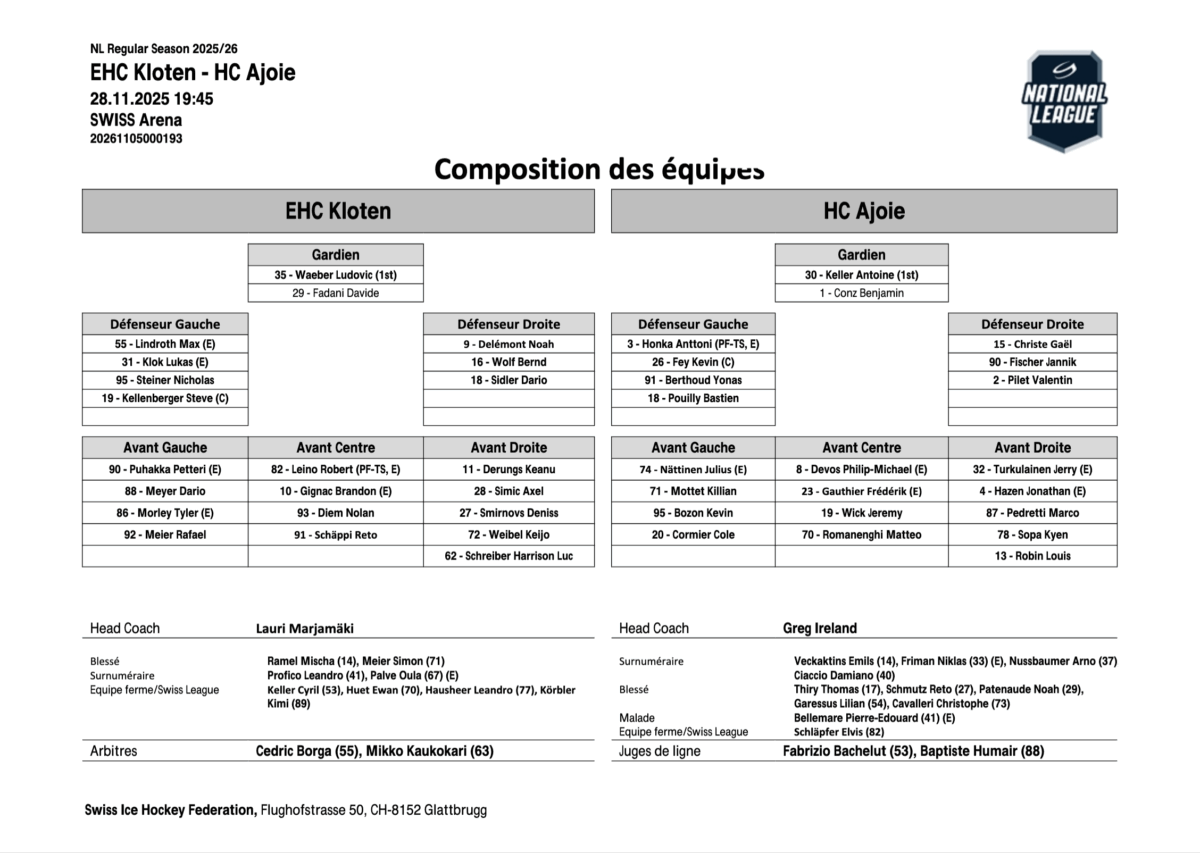 HC Ajoie : Keller (Conz); Honka, Christe; Fey, Fischer; Berthoud, Pilet; Pouilly; Nättinen, Devos, Turkulainen; Mottet, Gauthier, Hazen; Bozon, Wick, Pedretti; Cormier, Romanenghi, Sopa. Coach: Ireland