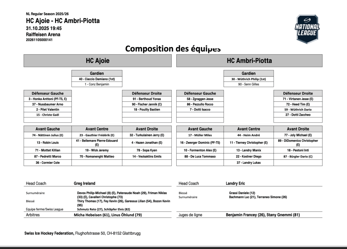 HC Ajoie: Ciaccio (Conz); Honka, Berthoud; Nussbaumer, Fischer; Pilet, Pouilly; Christe; Nättinen, Bellemare, Turkulainen; Robin, Gauthier, Hazen; Mottet, Wick, Sopa; Pedretti, Romanenghi, Veckaktins; Cormier. Coach: Ireland