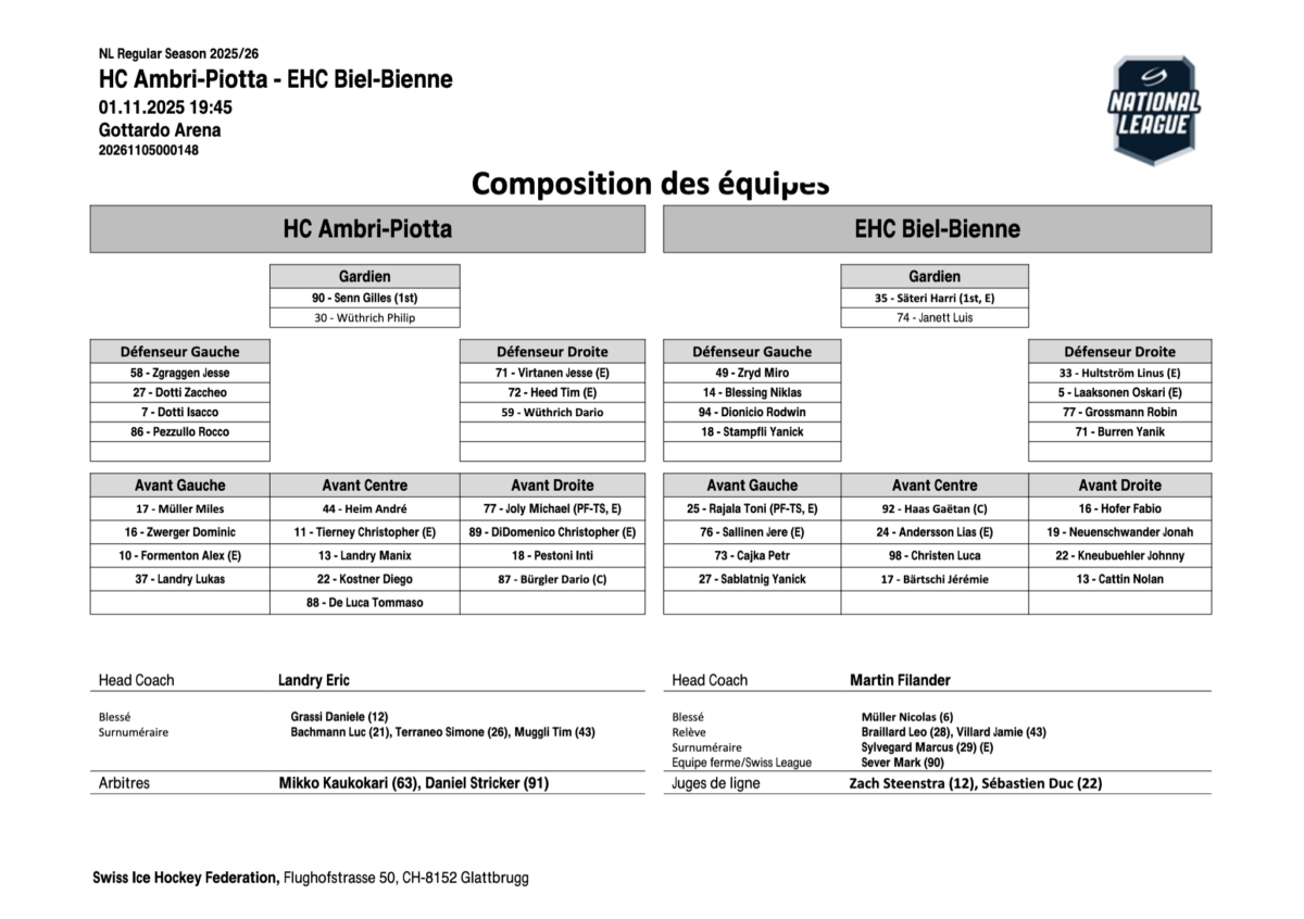 HC Ambrì-Piotta: Senn (Wüthrich); Zgraggen, Virtanen; Dotti, Heed; Dotti, Wüthrich; Pezzullo; Heim, Tierney, Landry; Kostner, De Luca, Müller; Joly, Zwerger, DiDomenico; Formenton, Pestoni, Landry; Bürgler. Coach: Landry