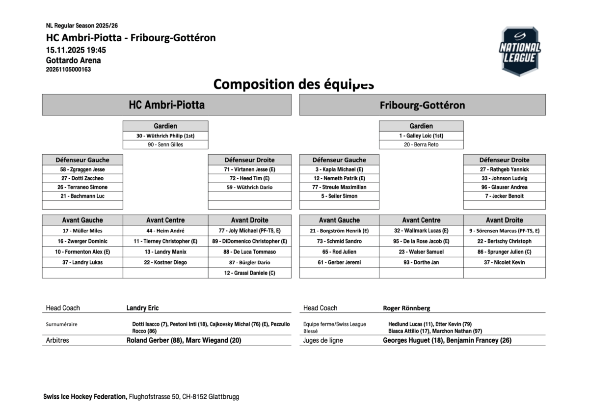 NATIONAL LEAGUE – Ambrì-Piotta vs Fribourg: le line-up