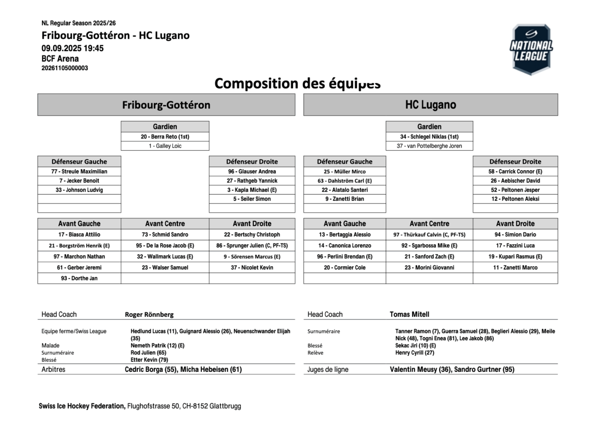 BCF Arena, Fribourg FR – Spect.: 9’280 – Arb.: Cedric Borga (55), Micha Hebeisen (61), Valentin Meusy (36), Sandro Gurtner (95) – SOG: 29-25