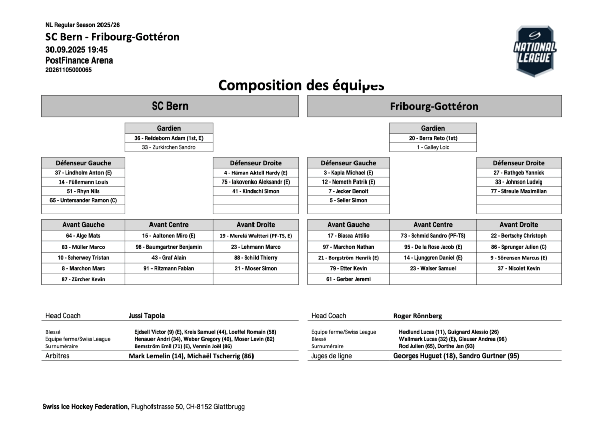 FRIBOURG: Berra (Galley); Kapla, Rathgeb; Nemeth, Johnson; Jecker, Streule; Seiler; Biasca, Schmid, Bertschy; Marchon, De la Rose, Sprunger; Borgström, Ljunggren, Sörensen; Etter, Walser, Nicolet; Gerber. Coach: Rönnberg