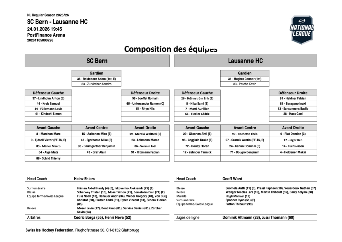 PostFinance Arena, Bern – Spect.: 16’501 – Arb.: Cedric Borga, Henri Neva, Dominik Altmann, Jussi Thomann – SOG: 31-24