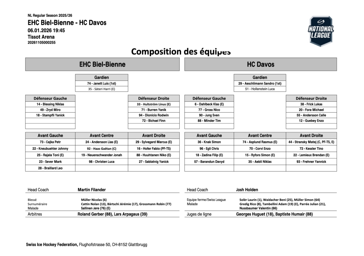 Le HC Bienne a livré une prestation intense et courageuse, récompensée au bout d’un scénario complètement fou face au leader HC Davos. Les Seelandais ont frappé fort d’entrée, imposant un rythme élevé et un forechecking agressif qui a longtemps étouffé les Grisons. Malgré cette domination initiale, c’est Davos qui a ouvert la marque, profitant de l’une de ses premières incursions offensives pour faire preuve de son réalisme froid, incarné par Rasmus Asplund. Loin de se décourager, Biel a poursuivi sur sa lancée, affichant une détermination remarquable et un engagement constant. Le jeu est ensuite devenu plus équilibré, avec un HC Davos plus solide physiquement, mais toujours sous pression. Le mérite des Biennois a été de rester fidèles à leur plan, trouvant finalement l’égalisation grâce à une action individuelle pleine de sang-froid signée Fabio Hofer, symbole de l’abnégation locale.