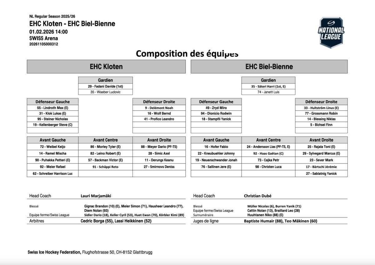 Le début du troisième acte est un choc pour les locaux. Lias Andersson contourne la cage et glisse le puck entre les jambières de Fadani pour le 0-2. Sur le scénario du match, les visiteurs peuvent s’estimer correctement payés. Mais Kloten ne lâche rien et relance le suspense grâce à Smirnovs, bien servi dans le slot. La pression devient étouffante, Bienne plie. Après une faute de Petr Cajka, Dario Meyer finit par égaliser en supériorité numérique. La prolongation est inévitable. Elle tourne à l’avantage des Aviateurs. Lindroth tranche le débat d’un tir côté mitaine et offre une victoire précieuse à Kloten, qui renverse un match mal embarqué, met fin à sa série noire et dépasse Ambri au classement. Bienne, lui, manque l’occasion de se rapprocher de Berne. Vraiment dommage: à un petit peu moins de six minutes la fin, les Seelandais menaient bien de deux longueurs…