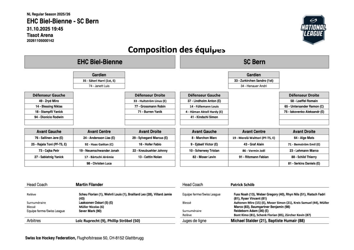 EHC Biel-Bienne: Säteri (Janett); Zryd, Hultström; Blessing, Grossmann; Stampfli, Burren; Dionicio; Rajala, Andersson, Hofer; Sallinen, Haas, Sylvegard; Cajka, Neuenschwander, Kneubuehler; Bärtschi, Christen, Cattin; Sablatnig. Coach: Filander