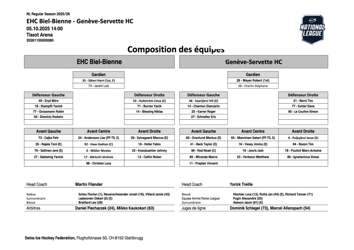 BIENNE : Säteri (Janett); Zryd, Hultström; Stampfli, Burren; Grossmann, Blessing; Dionicio; Andersson, Haas, Müller; Bärtschi, Christen; Cajka, Rajala, Hofer; Sallinen, Kneubuehler; Sablatnig, Cattin. Coach: Filander;