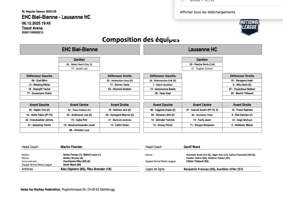 NATIONAL LEAGUE – Bienne vs Lausanne: le Line-up