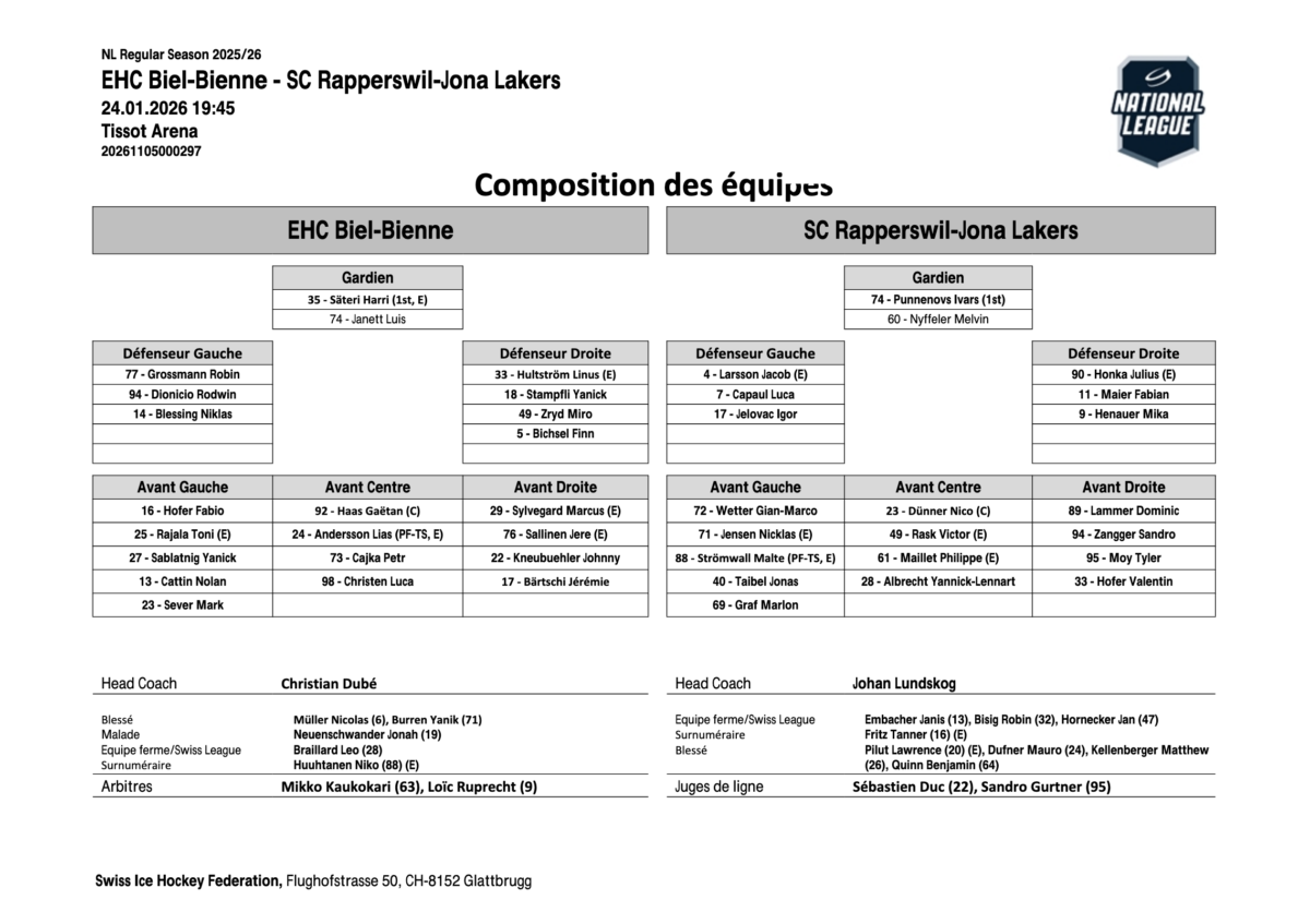 Tissot Arena, Biel/Bienne – Spect.: 6’033 – Arb.: Mikko Kaukokari, Loïc Ruprecht, Sébastien Duc, Sandro Gurtner – SOG: 37-35