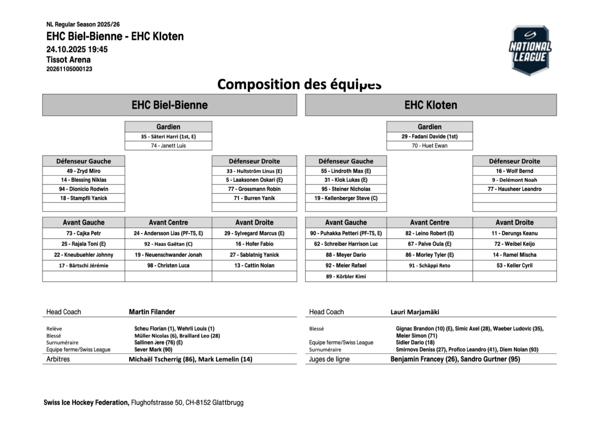 EHC Biel-Bienne : Säteri (Janett); Zryd, Hultström; Blessing, Laaksonen; Dionicio, Grossmann; Stampfli, Andersson, Haas; Neuenschwander, Christen, Sylvegard; Rajala, Hofer, Kneubuehler; Cajka, Sablatnig, Bärtschi; Cattin. Coach: Filander