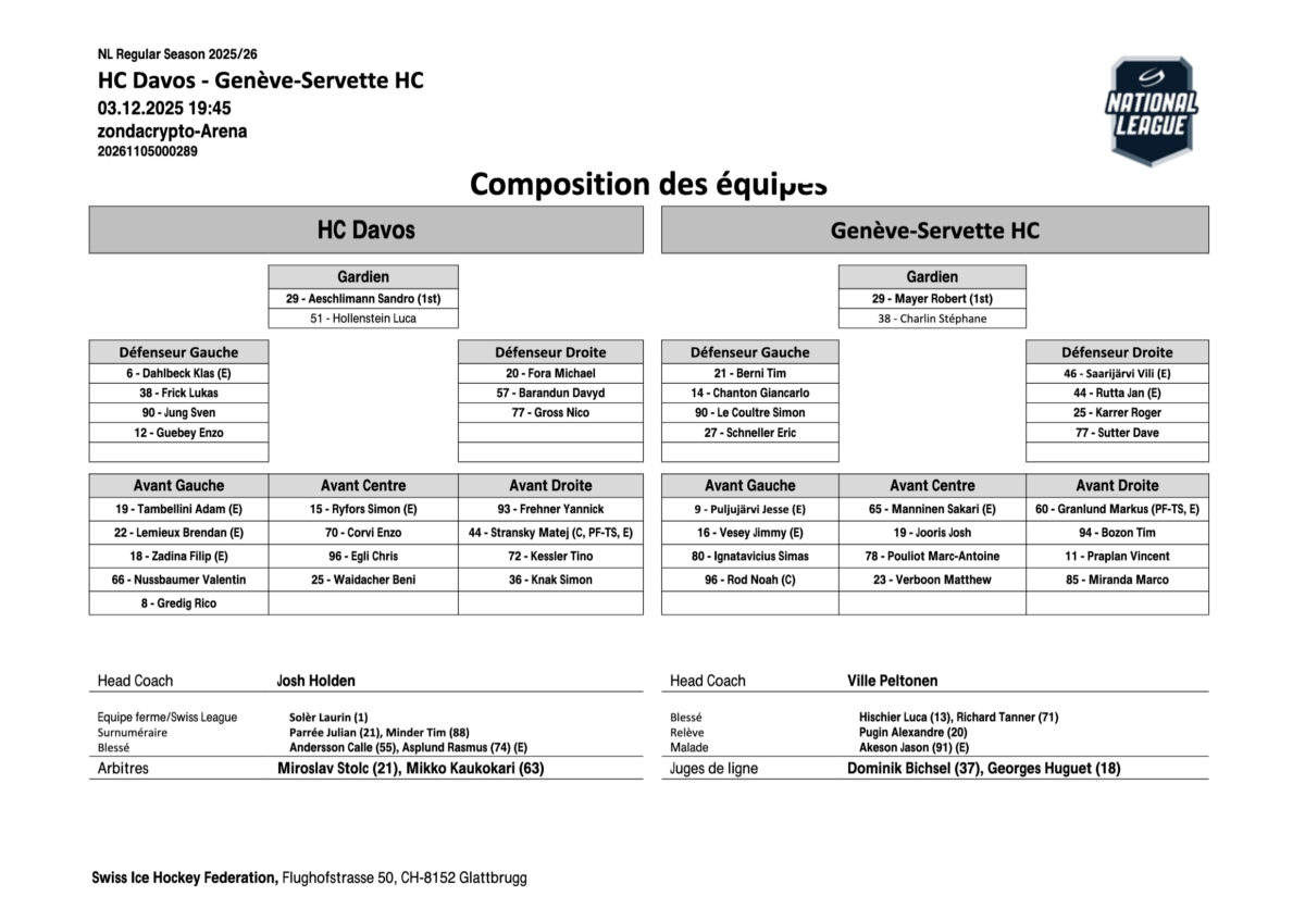 Genève-Servette HC: Mayer (Charlin); Berni, Saarijärvi; Chanton, Rutta; Le Coultre, Karrer; Schneller, Sutter; Puljujärvi, Manninen, Granlund; Vesey, Jooris, Bozon; Ignatavicius, Pouliot, Praplan; Rod, Verboon, Miranda. Coach: Peltonen
