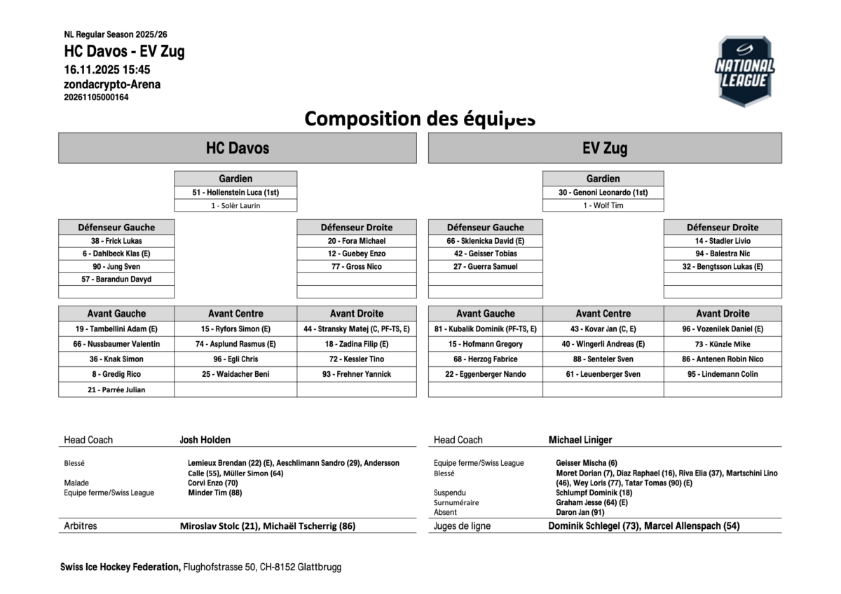 HC Davos: Hollenstein (Solèr); Frick, Fora; Dahlbeck, Guebey; Jung, Gross; Barandun; Tambellini, Ryfors, Stransky; Nussbaumer, Egli, Zadina; Knak, Kessler, Gredig; Frehner, Parrée. Coach: Holden;