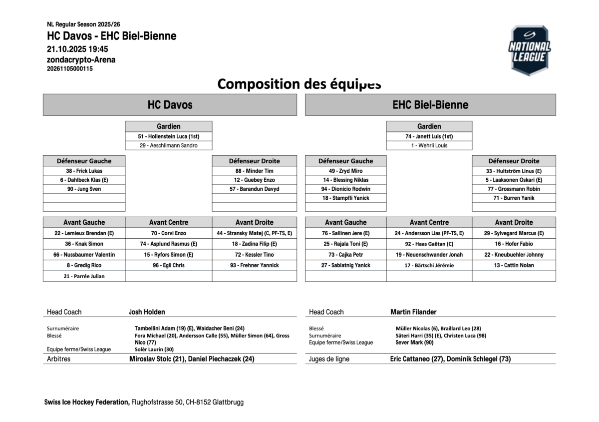 HC Davos : Hollenstein (Aeschlimann); Frick, Minder; Dahlbeck, Guebey; Jung, Barandun; Corvi; Lemieux, Asplund, Stransky; Knak, Ryfors, Zadina; Nussbaumer, Egli, Kessler; Gredig, Parrée, Frehner. Coach: Holden