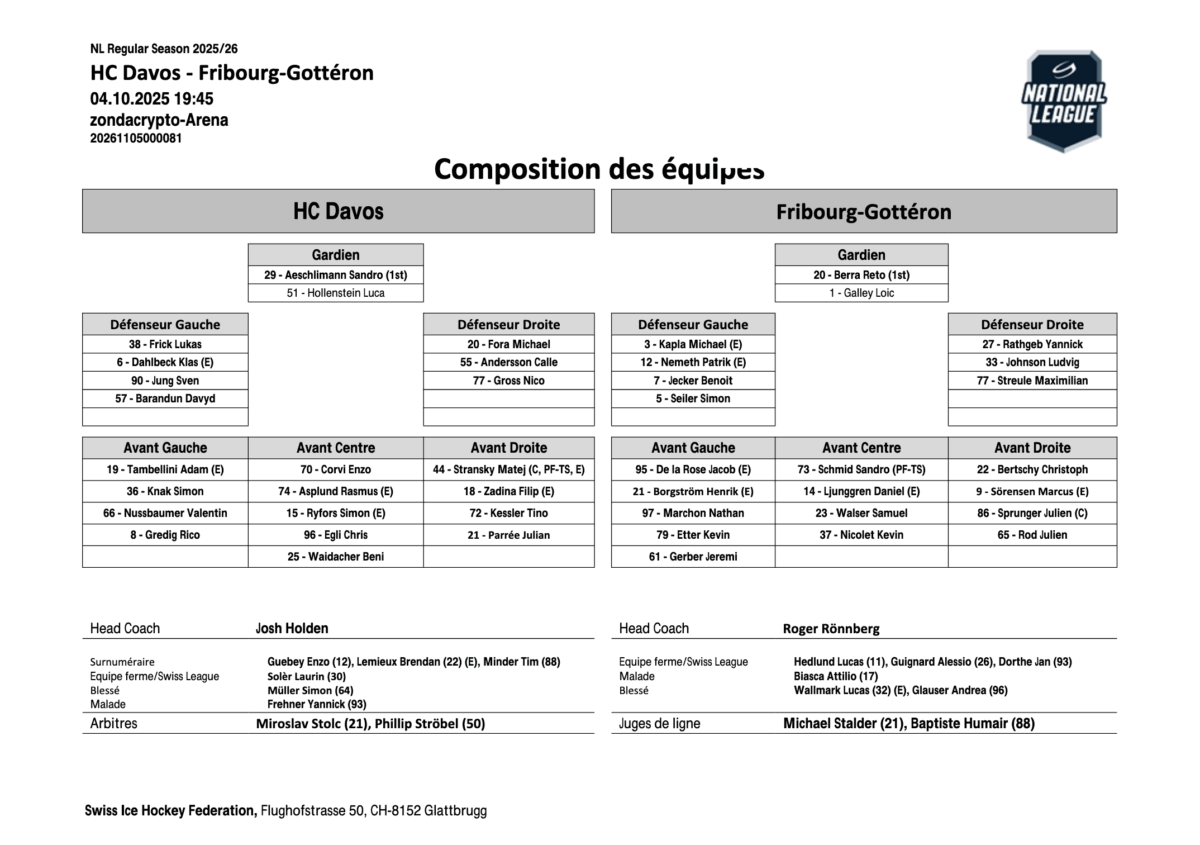 Le match a été disputé et offensivement équilibré, mais Davos a su mieux exploiter ses occasions. L’équipe a inscrit quatre buts pour six assistances, grâce notamment à Ryfors (1 but, 1 assist) et Stransky (2 buts), tandis que Fribourg-Gottéron a marqué trois buts pour trois assistances. Les tirs sur le but étaient parfaitement équilibrés avec 29 pour chaque équipe, mais Davos a légèrement dominé dans les tirs bloqués (15 contre 13), ce qui a limité les opportunités adverses.