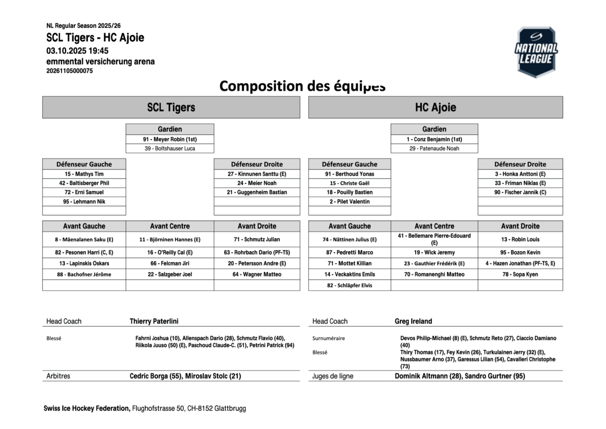 AJOIE: Conz (Patenaude); Berthoud, Honka; Christe, Friman; Pouilly, Fischer; Pilet; Nättinen, Bellemare, Robin; Pedretti, Wick, Bozon; Mottet, Gauthier, Hazen; Veckaktins, Romanenghi, Sopa; Schläpfer. Coach: Ireland