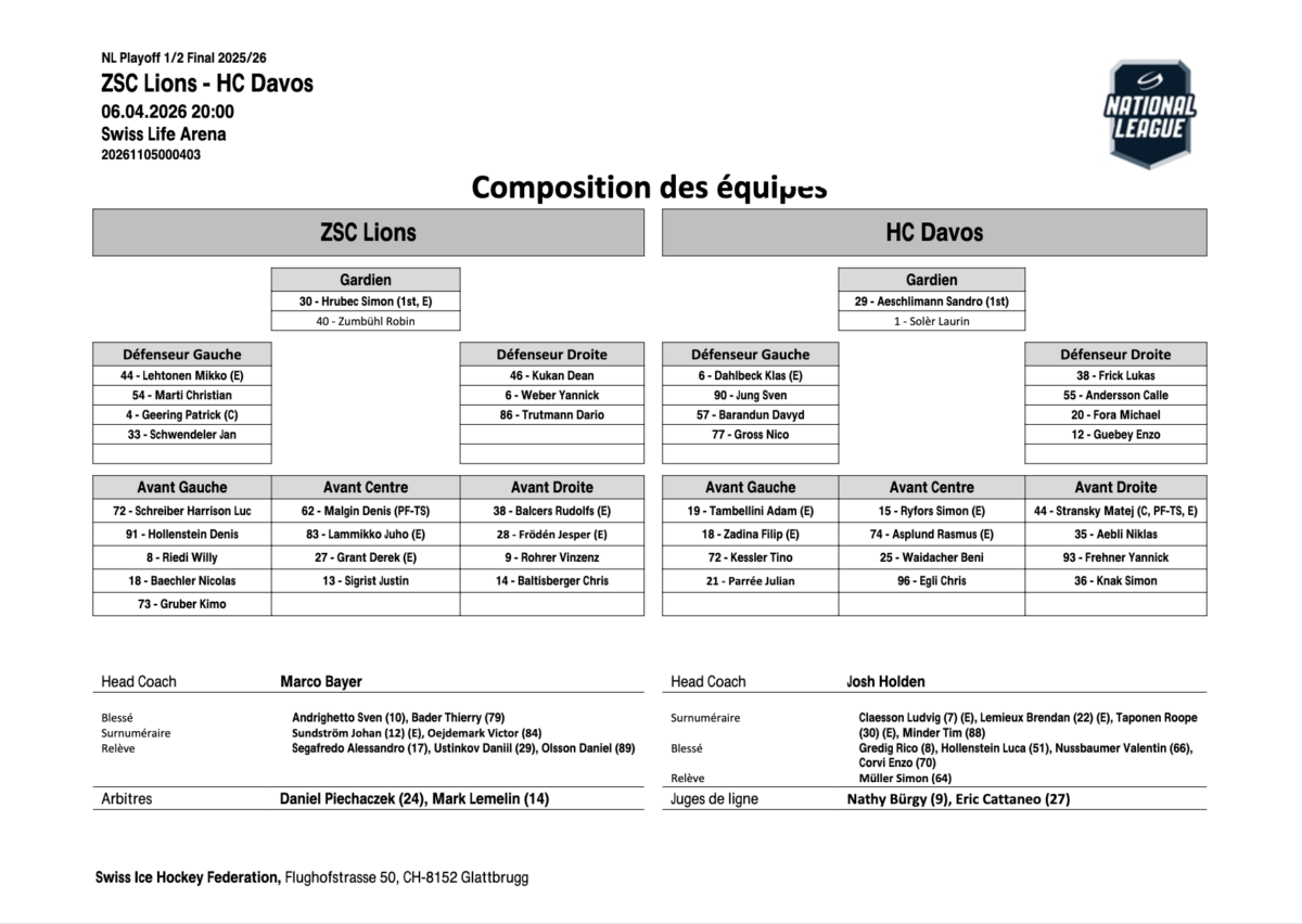 Le tournant arrive en début de troisième tiers. Zurich impose son rythme, fait tourner le puck et finit par être récompensé. Après un engagement gagné, Dean Kukan envoie le puck au but, Chris Baltisberger suit bien et conclut en deux temps pour redonner l’avantage aux Lions. Davos tente bien de revenir. Denis Malgin manque même le 3-1 et à force d’insister, les Lions finissent par plier le match en fin de rencontre, dans un cafouillage devant la cage. Impressionnants à domicile, les Lions enchaînent: 19e victoire consécutive en playoffs à la Swiss Life Arena.