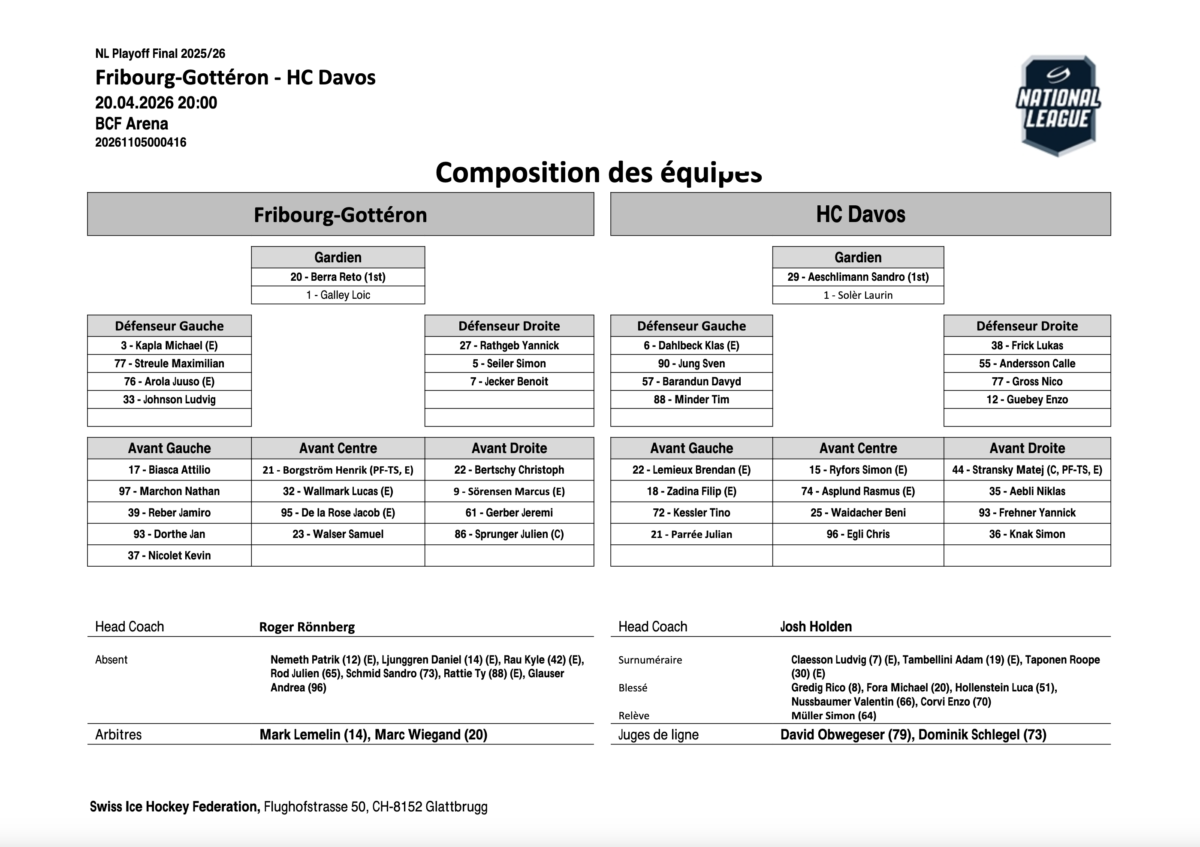 BCF Arena, Fribourg FR – Spect.: 9’372 – Arb.: Lemelin, Wiegand, Obwegeser, Schlegel – SOG: 32-27