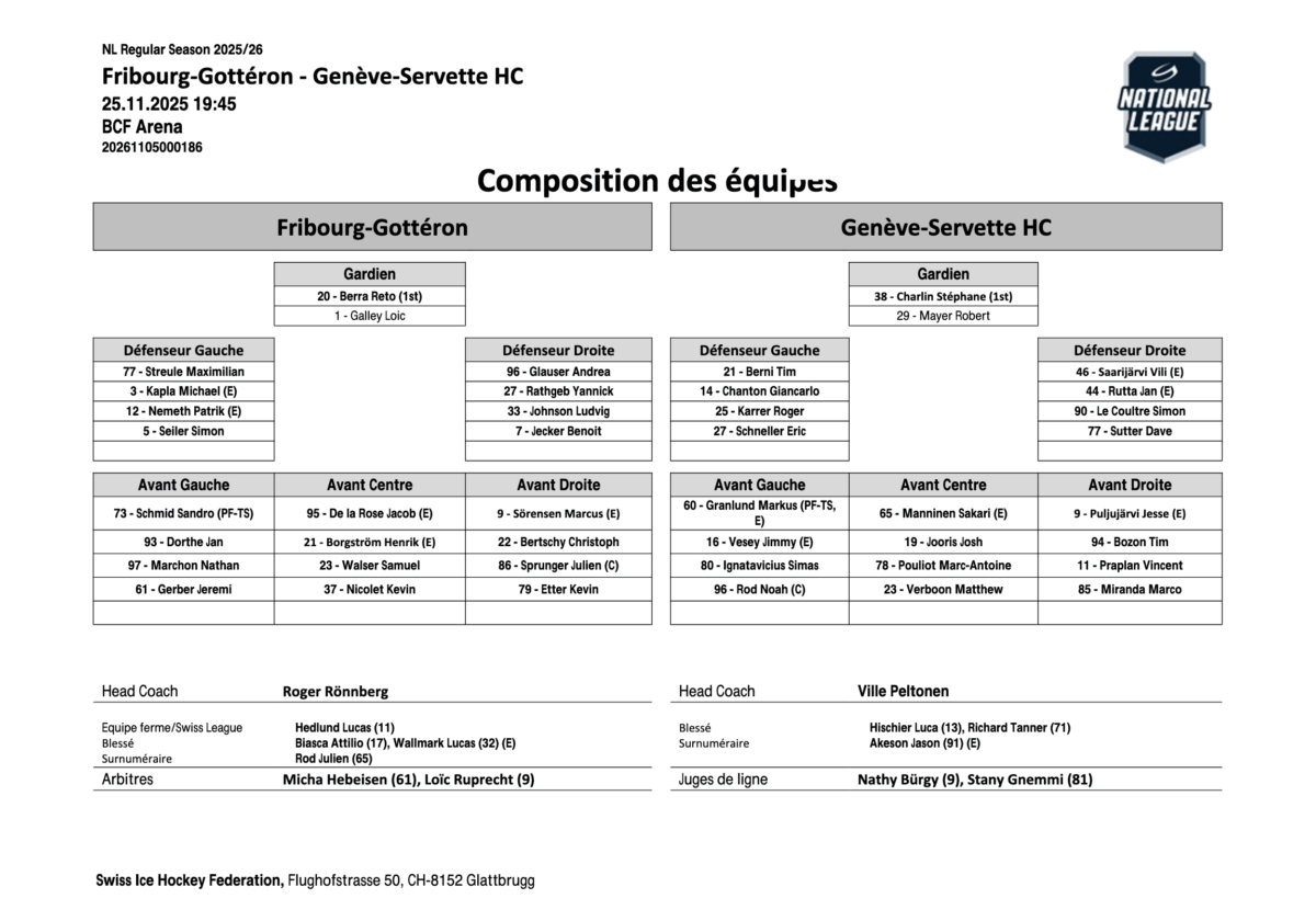 Fribourg-Gottéron: Berra (Galley); Streule, Glauser; Kapla, Rathgeb; Nemeth, Johnson; Seiler, Jecker; Schmid, Sörensen, Dorthe; De la Rose, Borgström, Walser; Nicolet, Marchon, Sprunger; Gerber, Bertschy, Marchon. Coach: Rönnberg
