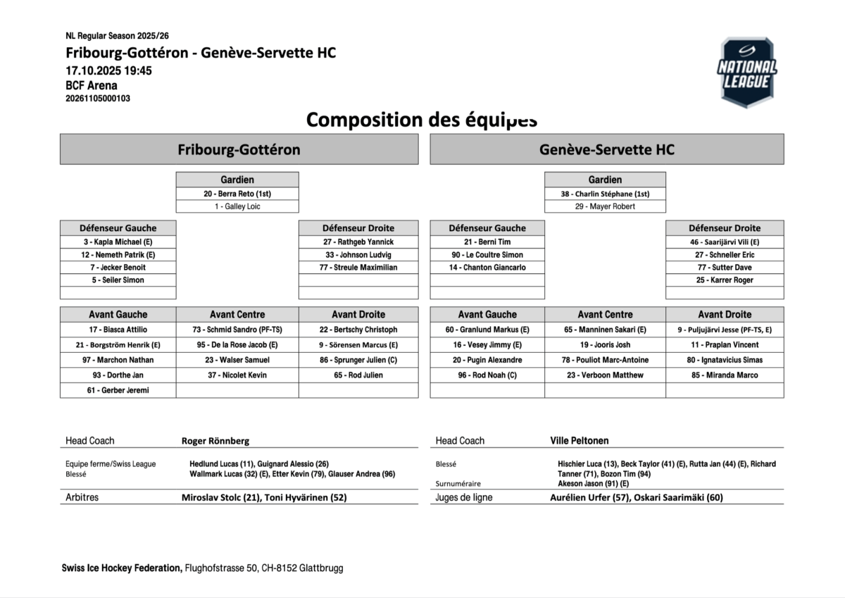 Fribourg-Gottéron : Berra (Galley); Kapla, Rathgeb; Nemeth, Johnson; Jecker, Streule; Seiler; Biasca, Schmid, Bertschy; Borgström, De la Rose, Sörensen; Marchon, Walser, Sprunger; Dorthe, Nicolet, Rod; Gerber. Coach: Rönnberg