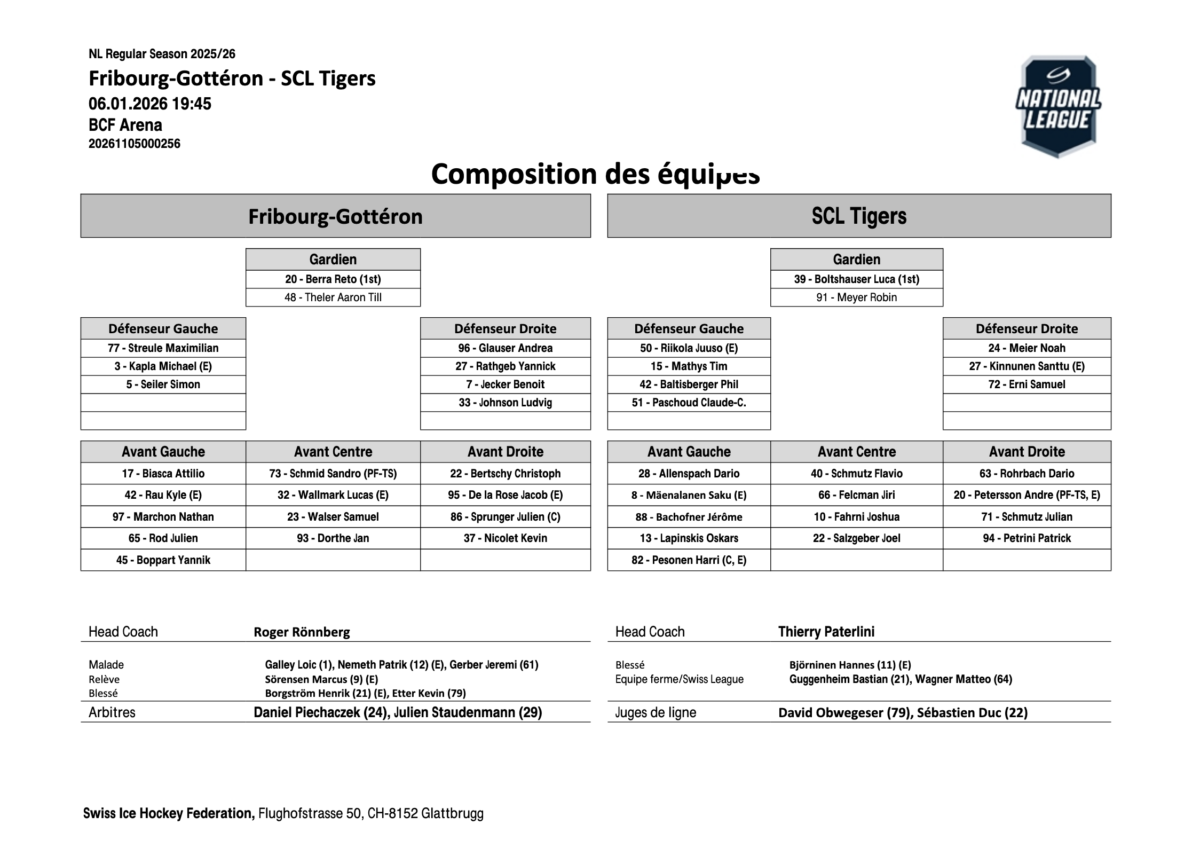 Fribourg-Gottéron: Berra (Theler); Streule, Glauser; Kapla, Rathgeb; Seiler, Jecker; Johnson; Biasca, Schmid, Bertschy; Rau, Wallmark, De la Rose; Marchon, Rod, Sprunger; Walser, Schmid, Nicolet; Boppart. Coach: Rönnberg