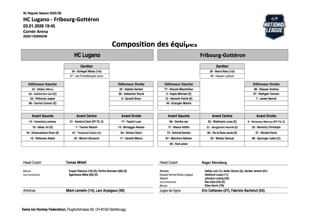 En troisième tiers, Gottéron presse, multiplie les tirs et profite de quelques moments chauds devant Schlegel, mais le gardien tessinois veille. Rathgeb se distingue par des interventions défensives cruciales et empêche plusieurs occasions nettes. Les Dragons se retrouvent à 6 contre 5 dans la dernière minute, mais la défense luganaise tient bon, bloque toutes les passes et les tirs. Dans ce duel physique, mais de qualité, les Tessinois engrangent les trois points et confirment leur maîtrise du match, tandis que Gottéron quitte la Cornèr Arena la tête basse. Meilleurs hommes du match : Fazzini pour Lugano et Rathgeb pour les Dragons, symboles de ce duel serré et intense.