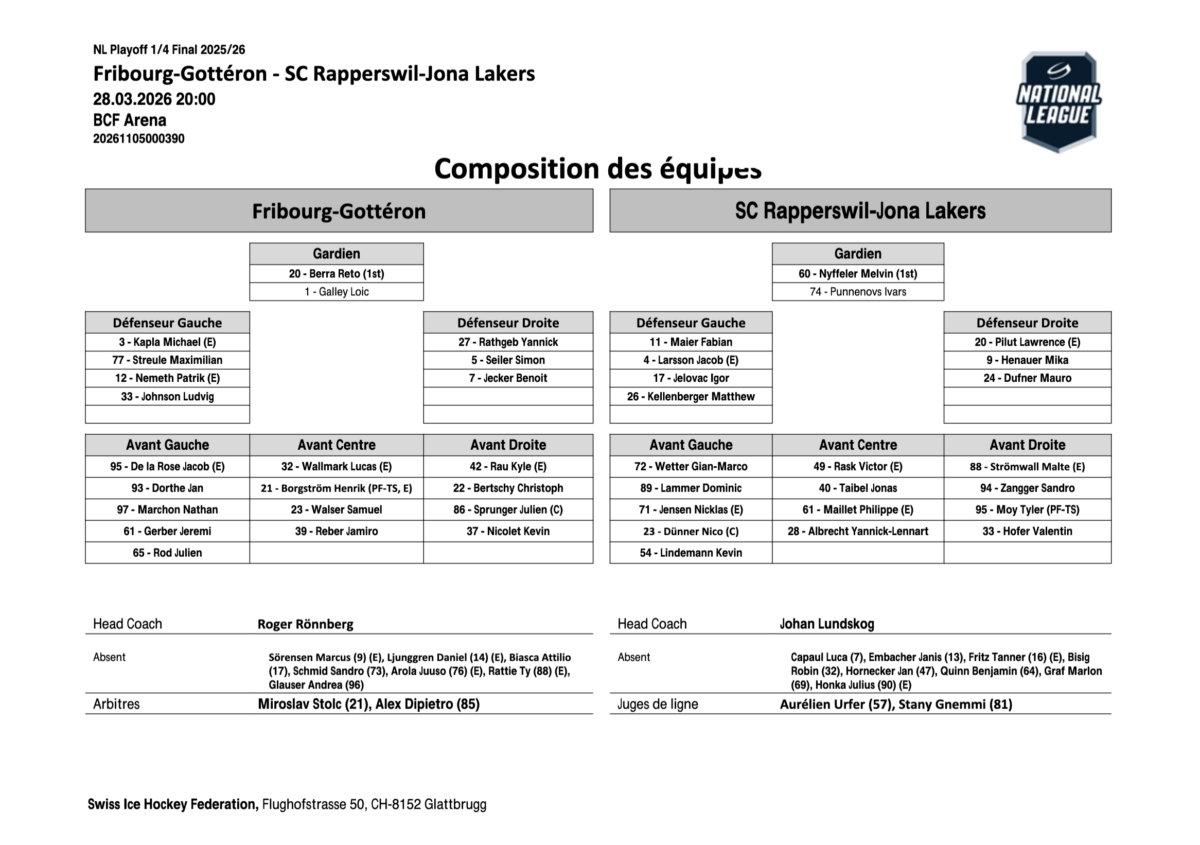 BCF Arena, Fribourg FR – Spect.: 9’372 – Arb.: Stolc, Dipietro, Urfer, Gnemmi – SOG: 23-29