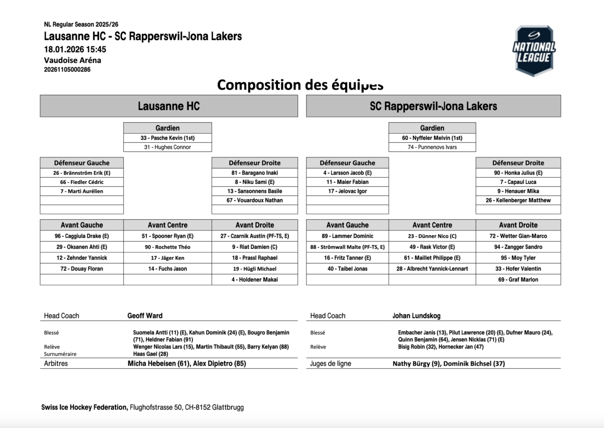 Le tournant est survenu en troisième période. Sandro Zangger a donné l’avantage aux Lakers, punissant une défense lausannoise hésitante. Dos au mur, le LHC a réagi grâce à Ahti Oksanen, but du patin validé après vidéo, pour arracher la prolongation. Mais comme souvent cette saison, Lausanne a craqué au moment décisif. À trois contre trois, alors que Lausanne aurait pu prétendre faire la différence avant, Victor Rask a trouvé l’ouverture sous la barre de Kevin Pasche, offrant la victoire aux visiteurs après validation vidéo. Malgré de bonnes intentions et plusieurs occasions nettes, le LHC concède une nouvelle défaite à domicile. Rapperswil, plus réaliste, repart avec deux points précieux. Lausanne, lui, continue de chercher des réponses devant son public. Et sent le souffle de ses poursuivants dans la nuque…