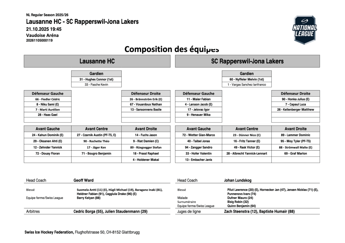 Lausanne HC: Hughes (Pasche); Fiedler, Brännström; Niku, Vouardoux; Marti, Sansonnens; Haas; Czarnik, Rochette, Jäger; Bougro, Kahun, Fuchs; Oksanen, Riat, Zehnder; Rüegsegger, Douay, Prassl; Holdener. Coach: Ward