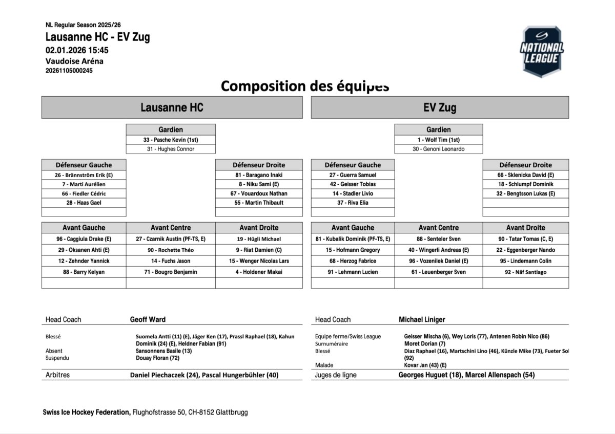 Dans le dernier tiers, rien à signaler Lausanne gérant son avance et Zoug pensant déjà à préparer la réception de Kloten. Avec les nombreux absents dans ses rangs, le club vaudois a pu donner du temps à ses jeunes joueurs et Kelyan Barry y est même allé de son premier but en ligue nationale. Marquer son premier but en carrière professionnelle contre Genoni, c’est pas mal. Même, dans une période difficile au niveau du contingent, c’est l’occasion rêvé de faire confiance à ses jeunes sortant de l’académie et même si cela doit parfois se transformer en défaite un jour ou un soir.