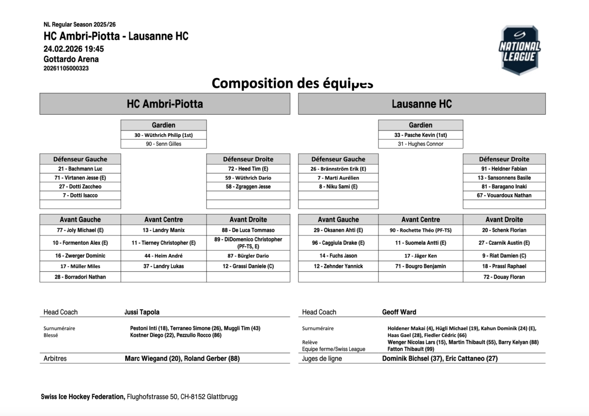 Ambri-Piotta a battuLausanne 3-2 après prolongation, devant un public chaud bouillant à la Gottardo Arena. Les Vaudois avaient pourtant pris le contrôle dès les premières minutes, ouvrant le score très vite grâce à Antti Suomela, déviant un tir de la bleue pour mettre son équipe en tête (2e). Peu après, Ahti Oksanen a doublé la mise sur un superbe mouvement collectif, laissant Ambri sous pression et menant 2-0 à la première pause. Mais les Biancoblu n’ont rien lâché. Dès le deuxième tiers, Ambri a haussé le ton : pressing haut, récupération rapide des palets et plusieurs occasions franches. Dominik Zwerger a réduit l’écart en transformant un joli service de Jesse Virtanen (33e, 1-2). Le défenseur finlandais a été décisif deux fois : il a offert le premier but d’Ambri pour revenir à 1-2, puis a marqué le but victorieux en prolongation. En supériorité numérique, Chris DiDomenico a dévié un tir de Michael Joly pour ramener les siens à égalité (37e, 2-2). Les Lausannois ont tenté de reprendre l’avantage en fin de tiers, mais Philip Wüthrich s’est montré impeccable dans ses cages.