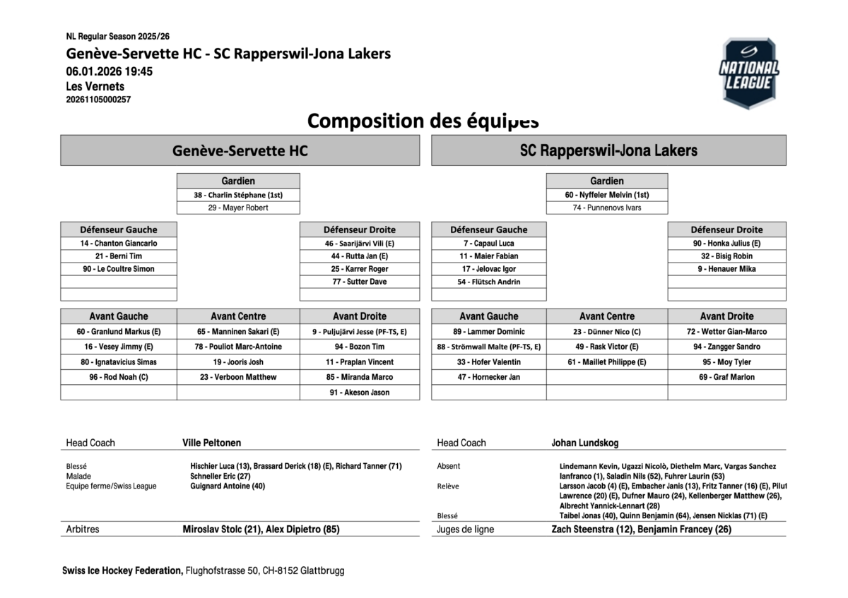 SC Rapperswil-Jona Lakers: Nyffeler (Punnenovs); Capaul, Honka; Maier, Bisig; Jelovac, Henauer; Flütsch; Dünner, Rask, Maillet; Lammer, Strömwall, Zangger; Hofer, Wetter; Hornecker, Graf. Coach: Lundskog