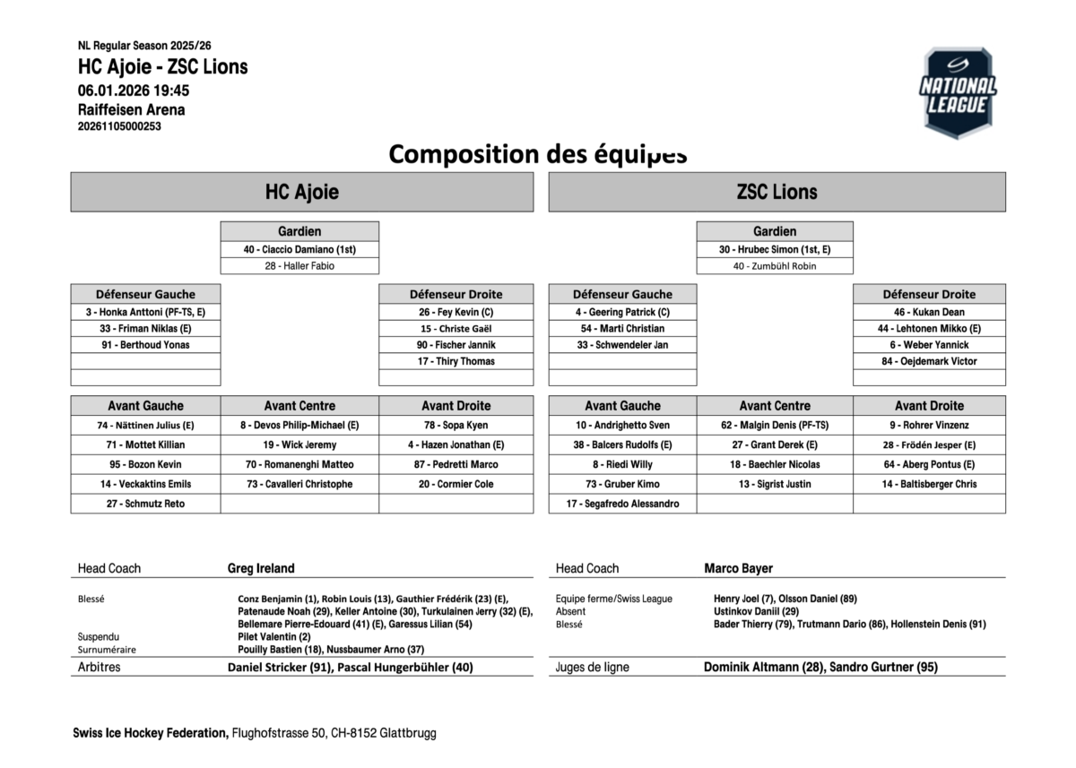 HC Ajoie: Ciaccio (Haller); Honka, Fey; Friman, Christe; Berthoud, Fischer; Thiry; Nättinen, Devos, Sopa; Mottet, Wick, Hazen; Bozon, Romanenghi, Pedretti; Veckaktins, Cavalleri, Cormier. Coach: Ireland