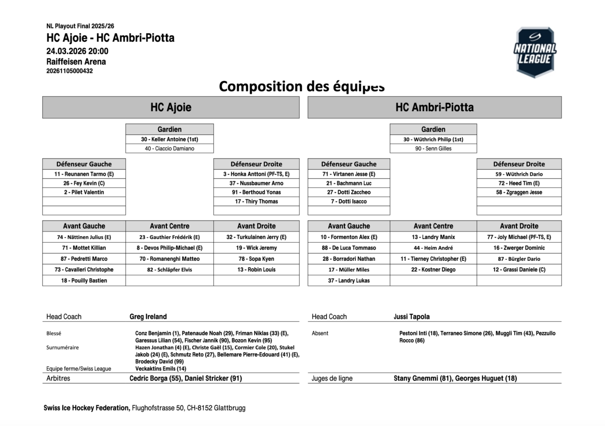 Mené 0-3 après quarante minutes, Ajoie avait besoin d’un miracle. Il y a cru… brièvement. Mais Ambri-Piotta a parfaitement géré les moments clés pour s’imposer 6-3 et faire déjà le break dans cette finale des playouts. Le réveil jurassien est pourtant immédiat au retour des vestiaires. À peine 53 secondes de jeu et Anttoni Honka relance complètement le match (41e, 1-3). La Raiffeisen Arena s’enflamme, Ajoie pousse, étouffe les Tessinois dans leur zone et finit par revenir à une longueur grâce à Philip-Michael Devos (50e, 2-3). Le momentum change de camp, le doute s’installe côté léventin.