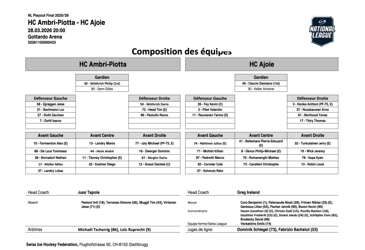 Tout se joue finalement dans l’ultime période. Julius Nättinen redonne espoir aux visiteurs en concluant une belle action initiée par Jerry Turkulainen. Mais Ambri ne panique pas. À quelques minutes de la fin, Joly fait parler sa puissance, s’infiltre et met le feu devant la cage adverse. Le puck traîne, Formenton surgit pour inscrire le but décisif. Seul bémol dans une soirée presque parfaite: la sortie prématurée de Nathan Borradori. Le jeune attaquant de 19 ans a violemment percuté la bande tête la première en disputant un puck. Après un passage par le banc, il a dû quitter ses coéquipiers et rejoindre les vestiaires, suscitant l’inquiétude. Ambri a désormais toutes les cartes en main. Une victoire mardi, et le maintien sera assuré.