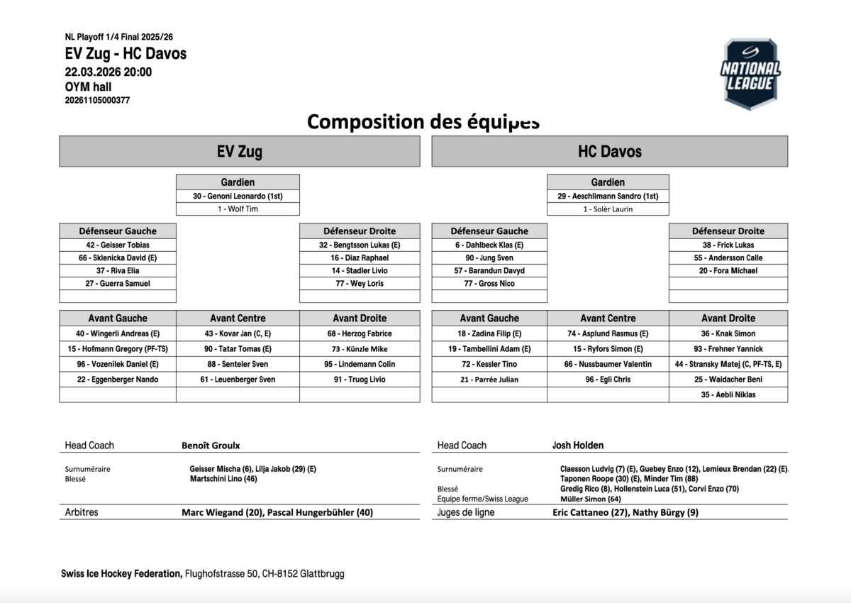 Et la sanction tombe. À 30 secondes de la fin, Adam Tambellini scelle le sort du match dans la cage vide. 0-2. Le verdict est cruel, mais limpide: Zoug a tout fait… sauf marquer. En face, Davos a joué juste, compact, efficace. Et surtout, il a pu compter sur un immense Sandro Aeschlimann. Dans ce genre de soirée, il n’y a pas mille explications: le hockey peut être injuste. Mais il est toujours impitoyable.