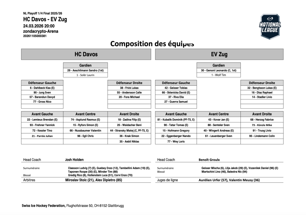 Ambiance de feu à Davos, et une équipe locale qui a immédiatement surfé sur cette vague d’enthousiasme. En face, Zoug a complètement déjoué… et l’a payé cash. Résultat: un cinglant 7-3 et une série désormais à sens unique (3-0). Le match a basculé très tôt. Trop tôt pour Zoug. Après quatre minutes, une première pénalité ouvre la porte aux Grisons. Et le powerplay davosien fait des ravages: Valentin Nussbaumer déclenche sans contrôle pour l’ouverture du score. Le ton est donné.