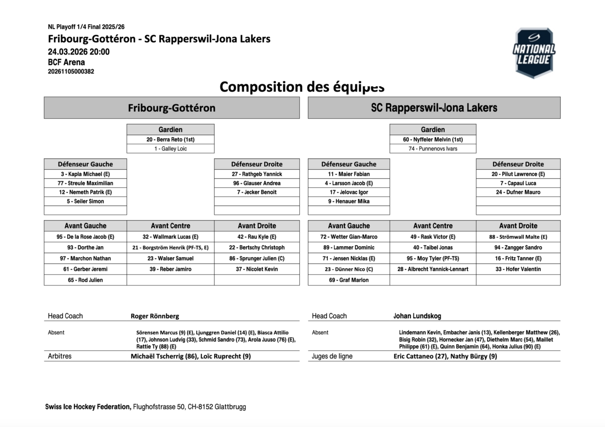 Le troisième tiers ressemble à une gestion maîtrisée. Rapperswil tente bien quelques contres, mais Reto Berra ferme la porte avec autorité, notamment devant Tyler Moy lancé seul. Et pour sceller définitivement l’affaire, Jeremi Gerber profite d’un rebond pour inscrire le quatrième. Un Gerber qui est méconnaissable durant ces playoffs. Fin de match tendue, quelques échauffourées, mais l’essentiel est là: Gottéron s’impose largement et reprend confiance au meilleur moment. Reste désormais à surveiller de près l’état de santé de Glauser, seule vraie ombre dans une soirée presque parfaite.