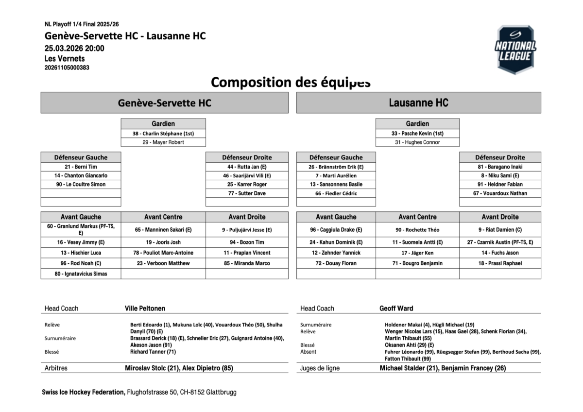 Le dernier tiers débute sur les mêmes bases: Genève tente de renverser la vapeur, mais l’énergie s’effrite au fil des minutes. Kevin Pasche, impérial dans la cage vaudoise, ferme la porte avec autorité. Et lorsque Iñaki Baragano trouve l’ouverture à cinq minutes du terme, l’issue ne fait plus de doute. La fin de match dégénère légèrement. Tensions, pénalités en cascade, nerfs qui lâchent: le GSHC perd aussi le fil émotionnel. Un but en powerplay encorene change rien à l’affaire, d’autant que Lausanne réplique immédiatement pour sceller définitivement le score. Avec ce succès maîtrisé (2-5), Lausanne réussit le coup parfait à l’extérieur. Les Lions prennent l’avantage dans la série et renversent la pression.