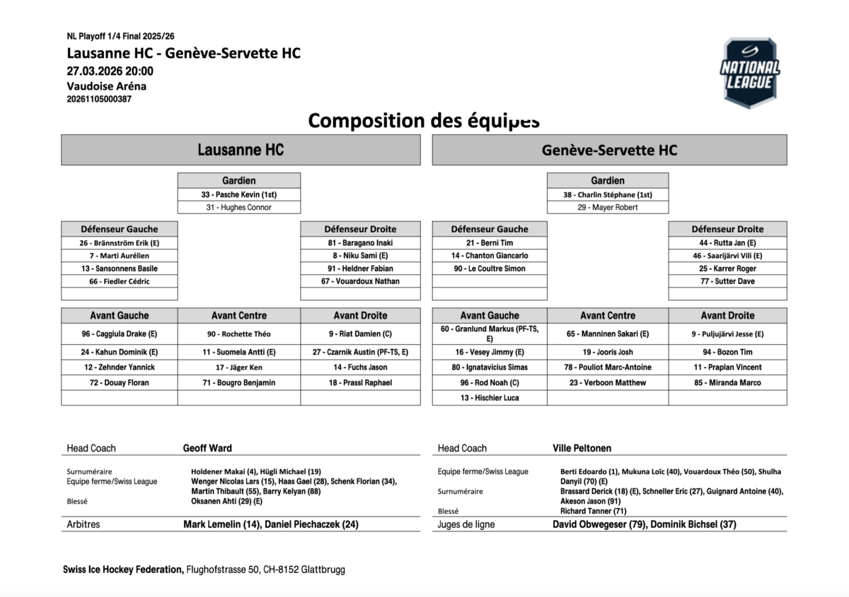 Le dernier tiers ne change pas la physionomie. Lausanne pousse, Genève punit. Matthew Verboon puis Jesse Puljujärvi enfoncent le clou en quelques minutes: 0-4, rideau ou presque. Les Lausannois sauvent l’honneur en fin de match, d’abord en power-play puis à forces égales, mais sans jamais réellement inquiéter des Grenat sûrs de leur fait. Avec ce succès à l’extérieur, Servette reprend l’avantage de la glace dans la série. Ville Peltonen a cru en son équipe et avait joué la carte de la stabilité. Le résultat lui donne raison…