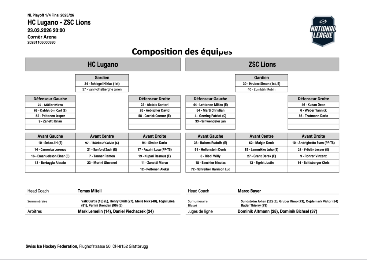 Cornèr Arena, Porza TI – Spect.: 6’116 – Arb.: Lemelin, Piechaczek, Altmann, Bichsel – SOG: 43-23