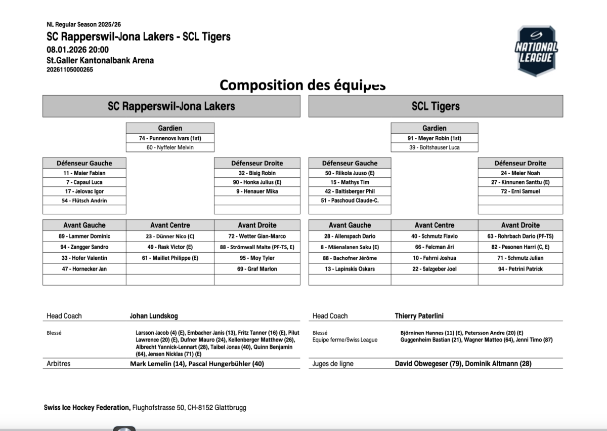 SC Rapperswil-Jona Lakers : Punnenovs (Nyffeler); Maier, Bisig; Capaul, Honka; Jelovac, Henauer; Flütsch; Lammer, Dünner, Wetter; Zangger, Rask, Strömwall; Hofer, Maillet, Moy; Hornecker, Graf. . Coach: Lundskog