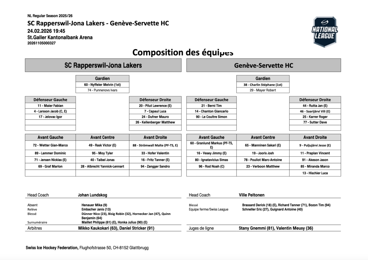 SC Rapperswil-Jona Lkers – Genève-Servette HC (19h45)