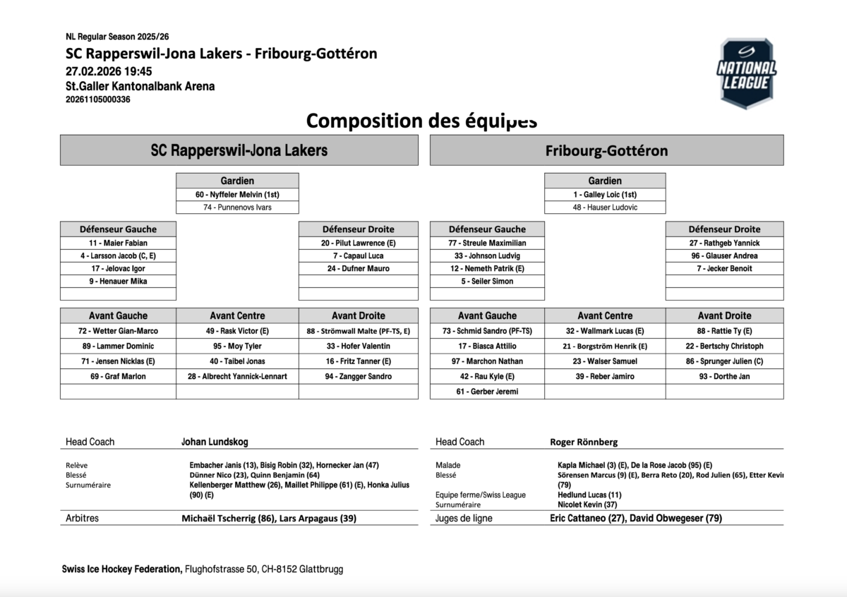 En deuxième période, les hommes de Roger Rönnberg poussent mais gaspillent un powerplay. Ils sont finalement récompensés à la 24e: tir de Benoît Jecker, déviation de Tye Rattie devant la cage, 1-1. Réaction immédiate des Lakers en supériorité numérique. Wetter, déjà passeur, marque et redonne l’avantage aux siens. Le boxplay fribourgeois, pourtant référence du championnat, craque au mauvais moment. Le tournant? Ce but saint-gallois annulé après vidéo, faute de preuve que le puck ait franchi la ligne. Car les Lakers accusent le coup et, comme souvent cette saison, les Dragons trouvent une solution. À la 54e, Henrik Borgström chipe le puck derrière la cage adverse et sert Rattie pour le 2-2. On file vers la prolongation? Pas question. À 83 secondes de la sirène, Patrik Nemeth surgit et assomme Rappi. Fribourg n’a pas brillé, mais Fribourg a gagné. On parlera d’une certaine constance… dans le résultat, pas toujours dans la manière.