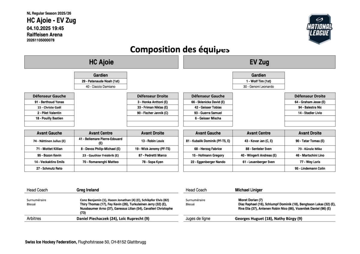 AJOIE: Patenaude (Ciaccio); Berthoud, Honka; Christe, Friman; Pilet, Fischer; Pouilly; Nättinen, Bellemare, Robin; Mottet, Devos, Wick; Bozon, Gauthier, Pedretti; Veckaktins, Romanenghi, Sopa. Coach: Ireland