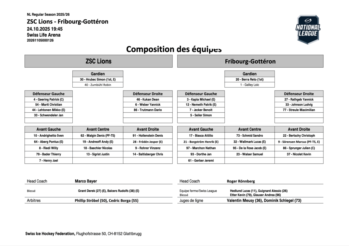 Fribourg-Gottéron : Berra (Galley); Kapla, Rathgeb; Nemeth, Johnson; Jecker, Streule; Seiler, Schmid, Wallmark; De la Rose, Walser, Borgström; Biasca, Bertschy, Sörensen; Marchon, Sprunger, Dorthe; Nicolet, Gerber. Coach: Rönnberg