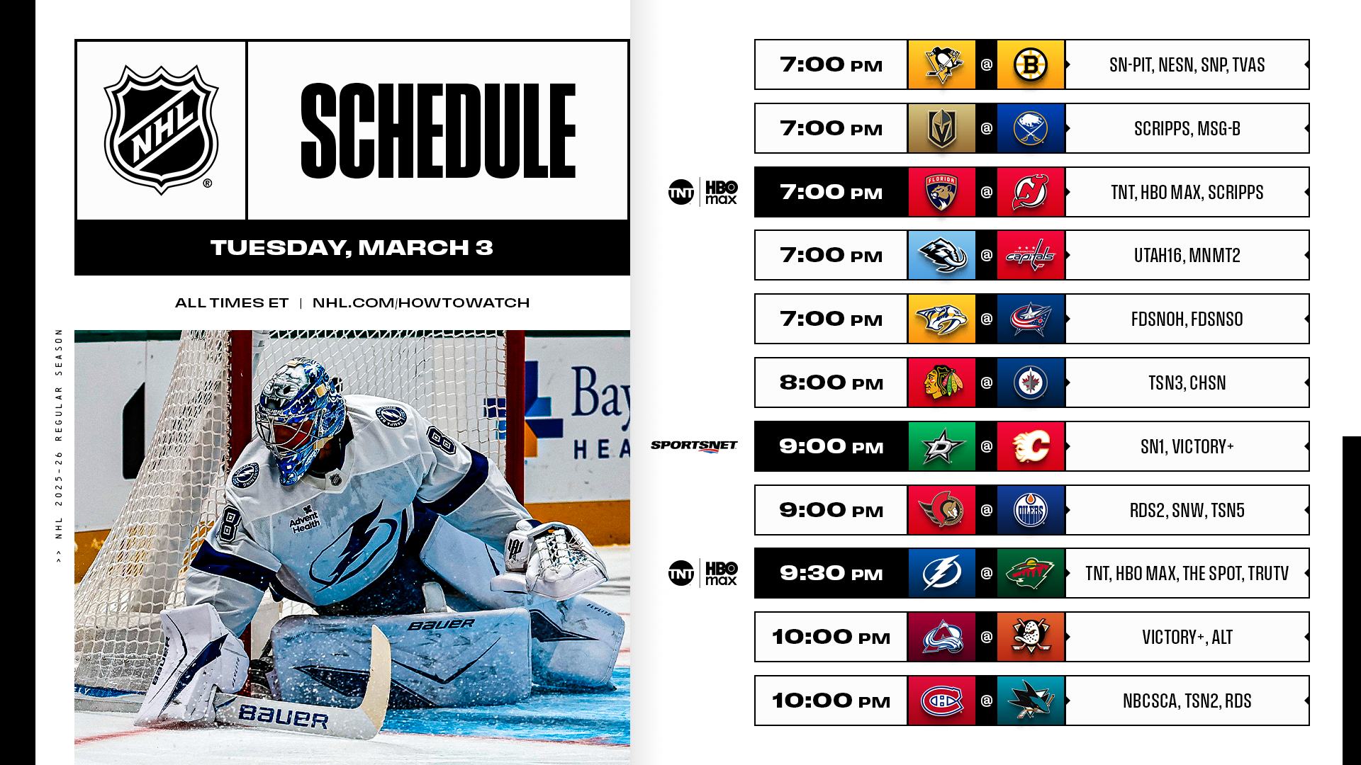 Une semaine historique pourrait débuter pour Kirill Kaprizov : il lui suffit d’un but pour devenir le meilleur buteur de l’histoire des Wild du Minnesota. Ce soir, face au Lightning, les Wild tenteront de rester dans la course aux trois premières places de la Division Centrale, tandis que Tampa Bay, malgré deux défaites consécutives pour la première fois depuis décembre, possède toujours le meilleur bilan à l’extérieur de la Ligue. Le gardien du Lightning Andrei Vasilevskiy continue sa série de points à l’extérieur : 8 matchs (7-0-1) et il est à deux victoires de rejoindre Martin Brodeur dans l’histoire avec neuf saisons consécutives à 30 victoires.e double-header de ce soir verra aussi les retrouvailles de Jack Hughes et Matthew Tkachuk, champions olympiques à Milan, mais désormais rivaux avec les Devils et les Panthers, chacun en quête de playoffs.