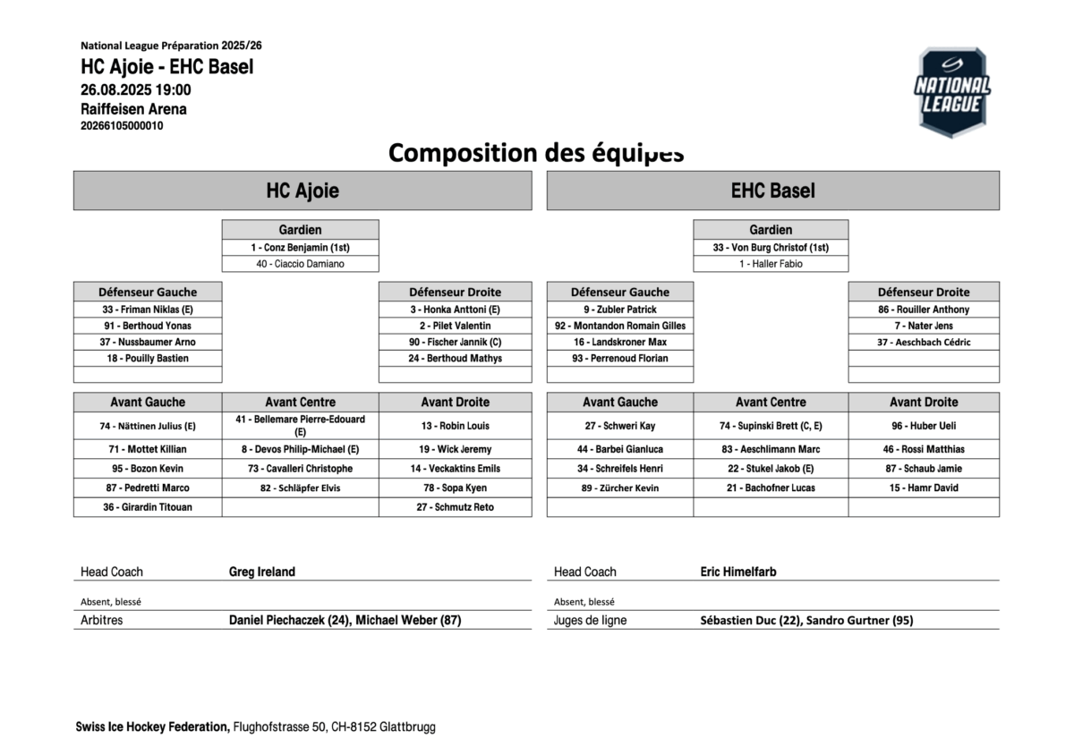 Raiffeisen Arena, Porrentruy JU – Spect.: 805 – Arb.: Daniel Piechaczek (24), Michael Weber (87), Sébastien Duc (22), Sandro Gurtner (95) – SOG: 41-14
