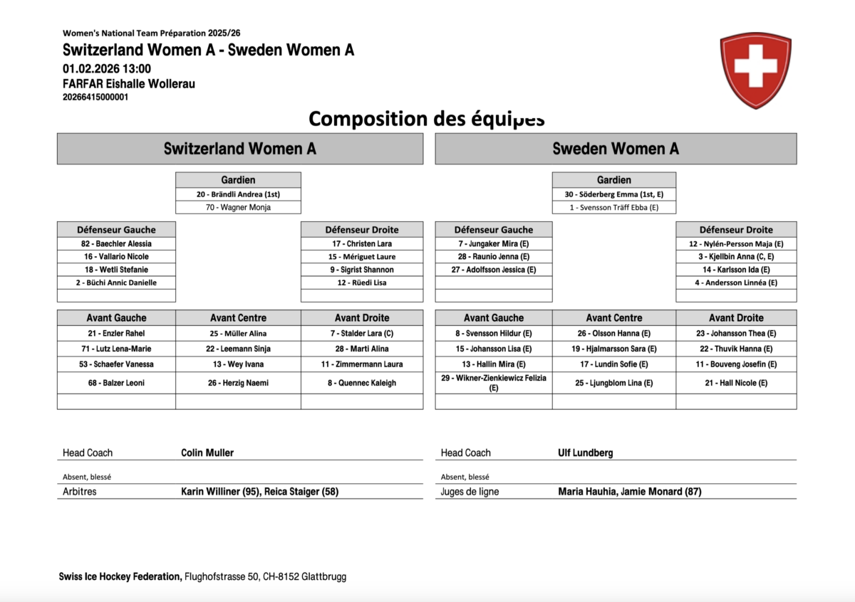 L’équipe nationale féminine suisse a bouclé sa répétition générale avant les Jeux de Milan par une victoire 4-2 contre la Suède à Wollerau, devant 200 spectateurs. Alina Müller et Vanessa Schaefer ont propulsé les Suissesses en tête 2-0 dès la 11e minute. Les Suédoises ont réduit l’écart par Thea Johansson (24e), mais Lisa Rüedi a inscrit le 3-1 avant la mi-match. Le suspense est resté entier jusqu’à la 54e minute avec le but de Hildur Svensson, mais Müller, en fin de match, a scellé le 4-2 dans un filet vide. La Suisse est arrivée hier Milan, où elle affrontera successivement la République tchèque, le Canada, les États-Unis et la Finlande dans le groupe A.